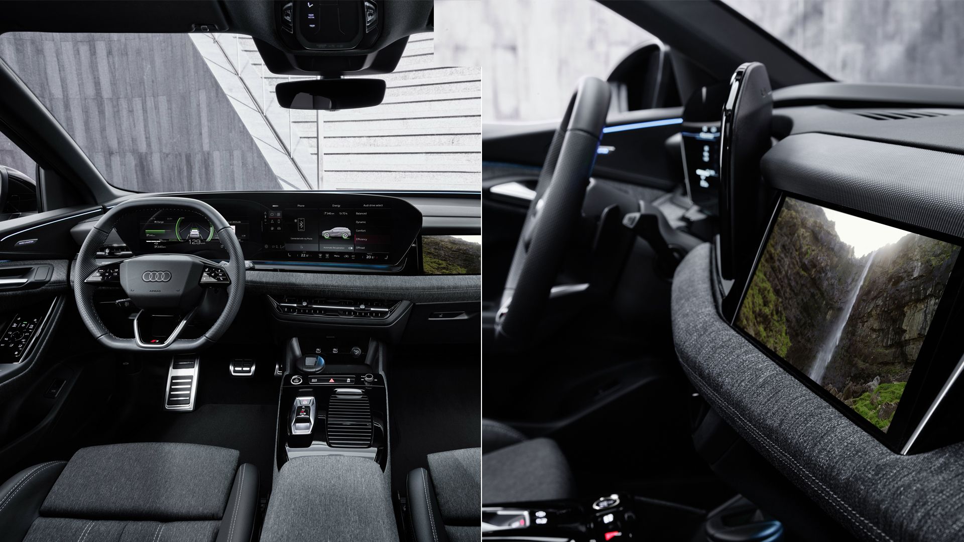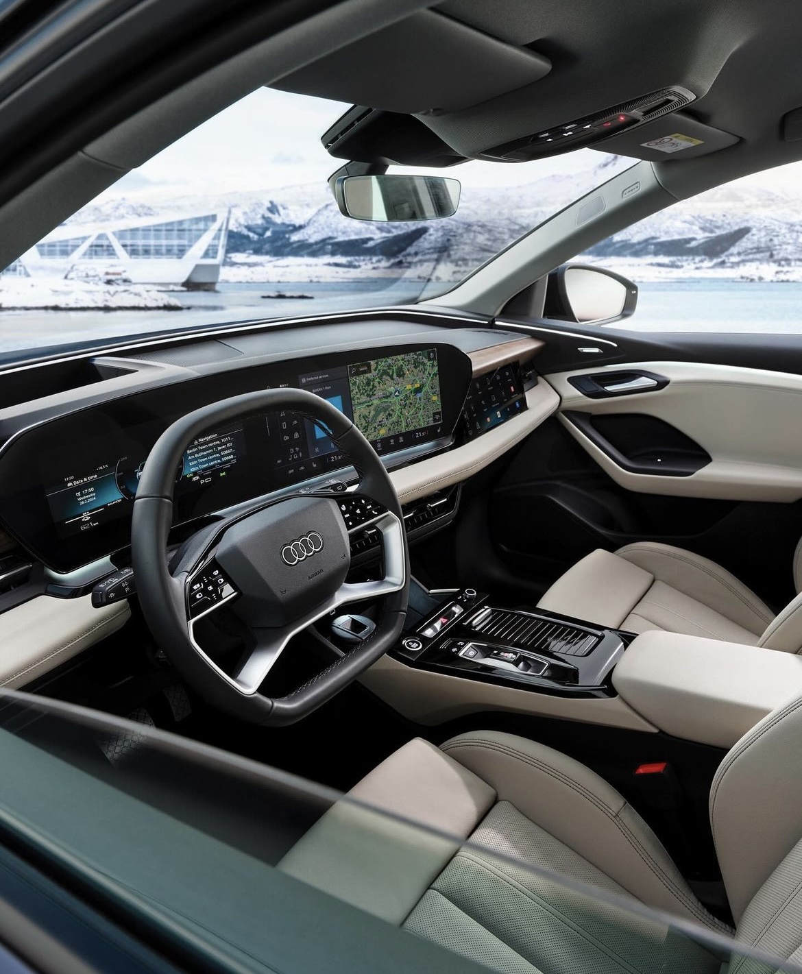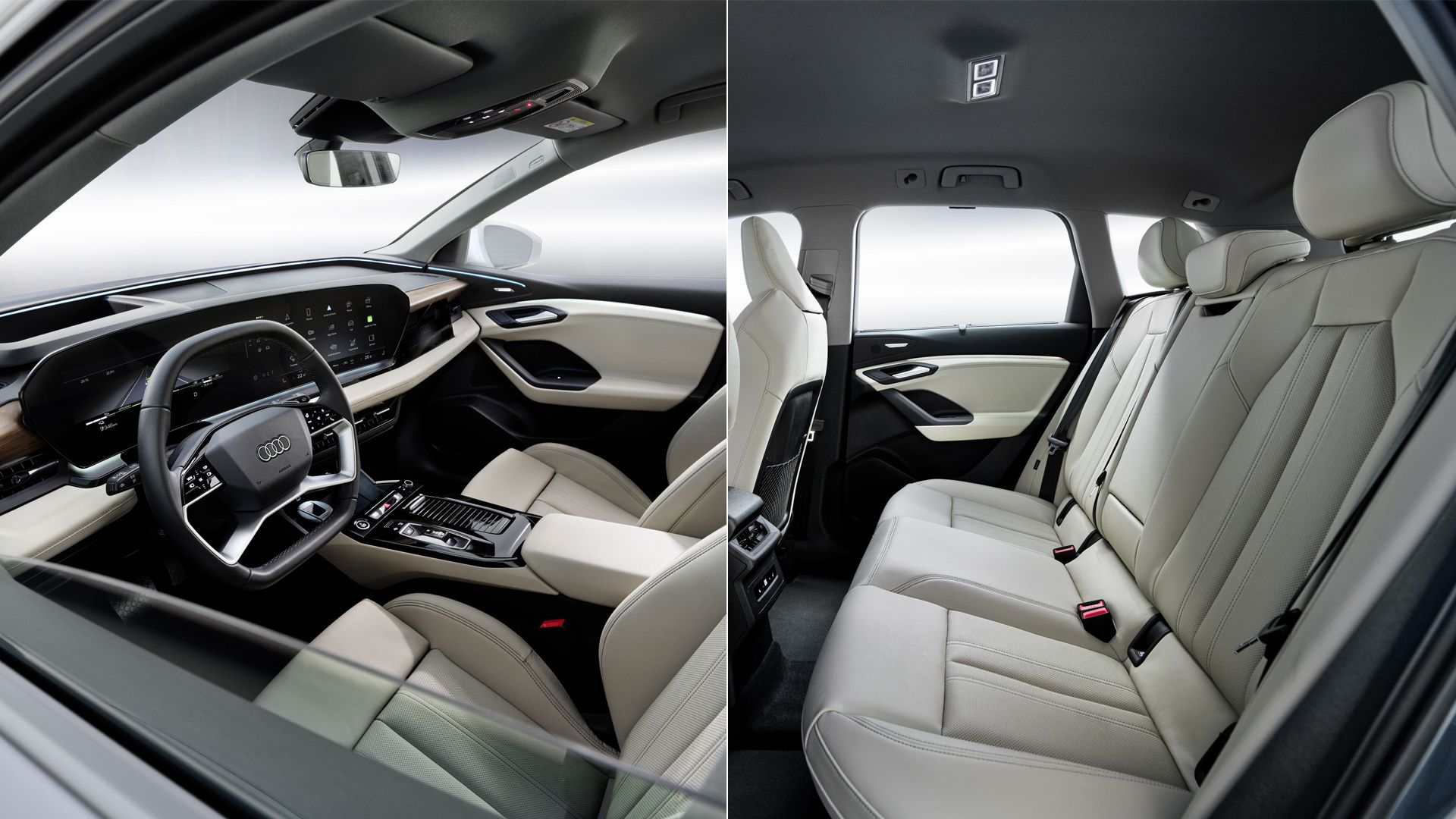 Upplev den nya, digitala interiören med funktioner som panoramadisplay, AR-head-up-display4, 5,6, Audi Assistant7, styrreglage i förardörren, dynamiska interaktionsljus4, 5 och 3D-ljudsystem med inbyggda högtalare i nackstöden4, 8.