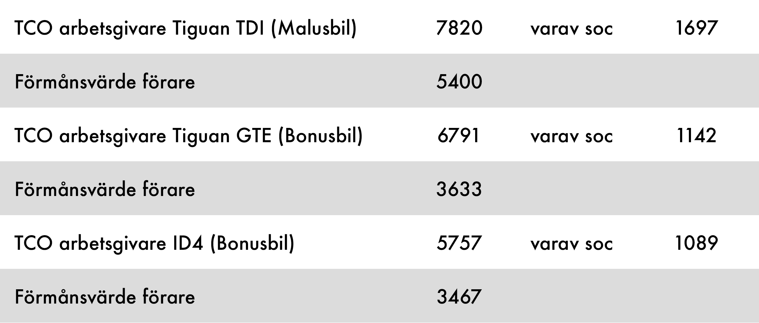 Den stora vinnaren i nya Bonus/Malus är således en ren elbil. Räkneexemplet ovan visar en besparing i arbetsgivarens TCO kostnad med 2063 SEK/mån och för föraren 1933 SEK/mån i förmånsvärde bruttobelopp kontra en bil i motsvarande storlek (Tiguan TDI vs ID.4).