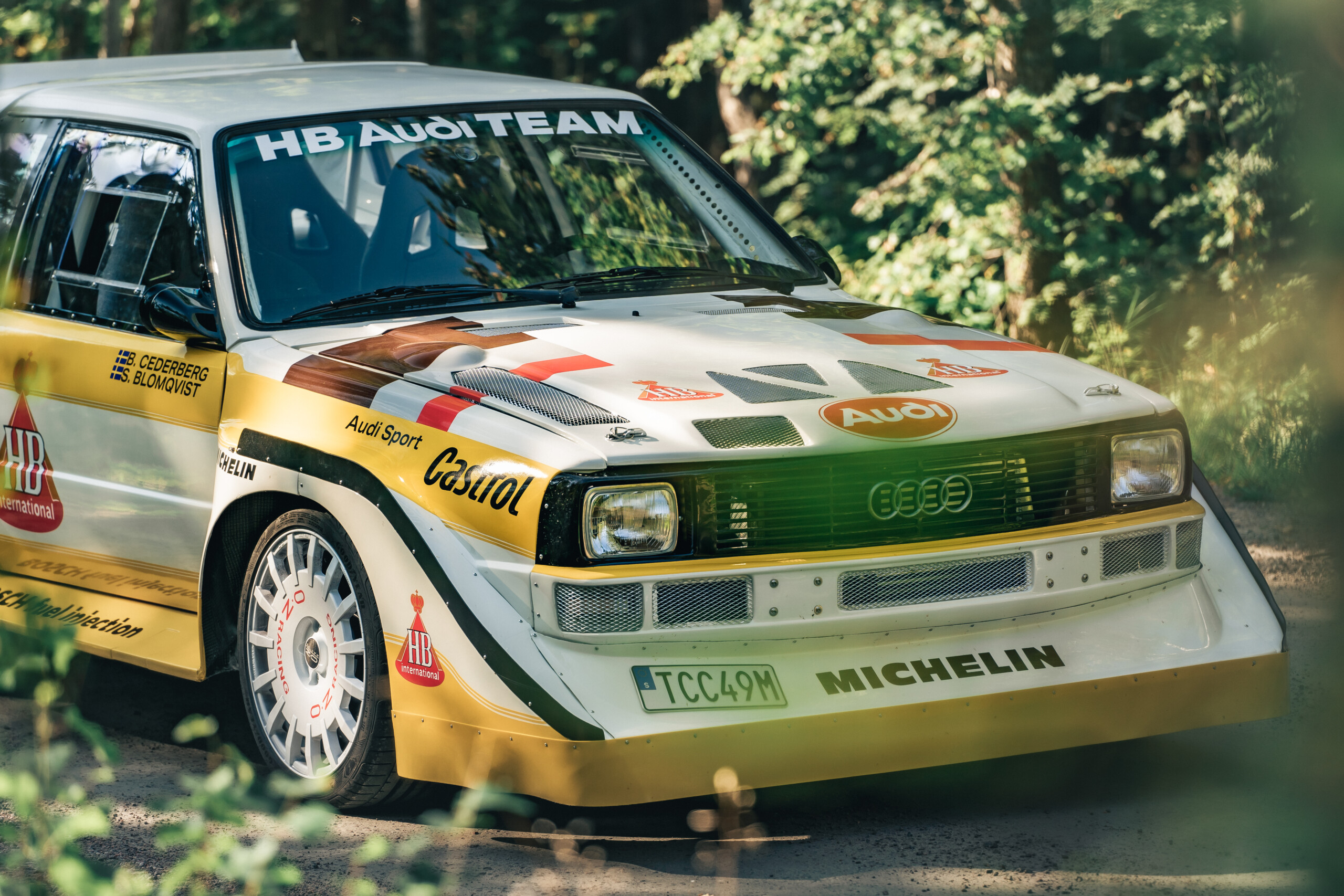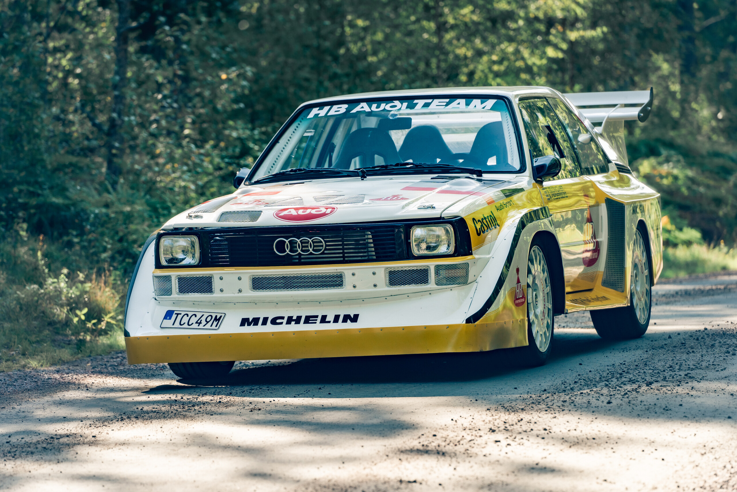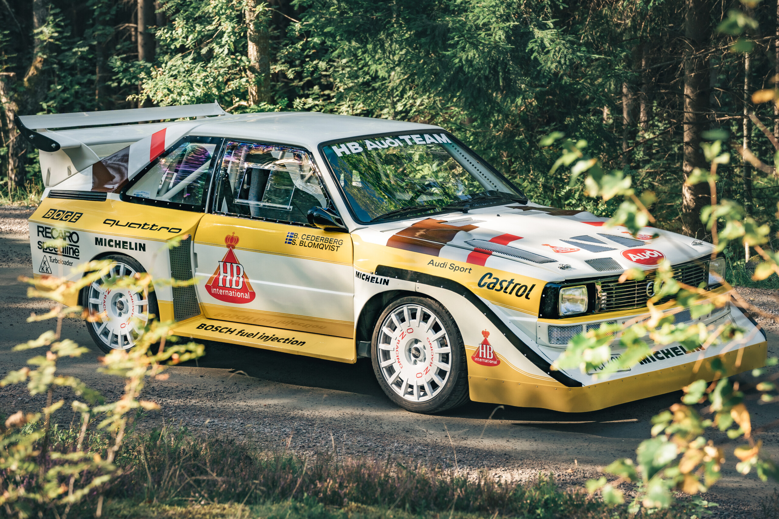 At the 1985 Rally Finland, Audi debuted the Audi Sport Quattro S1 Evo2, instantly recognizable by its aggressive wide fender flares, massive front spoiler, and large rear wing.