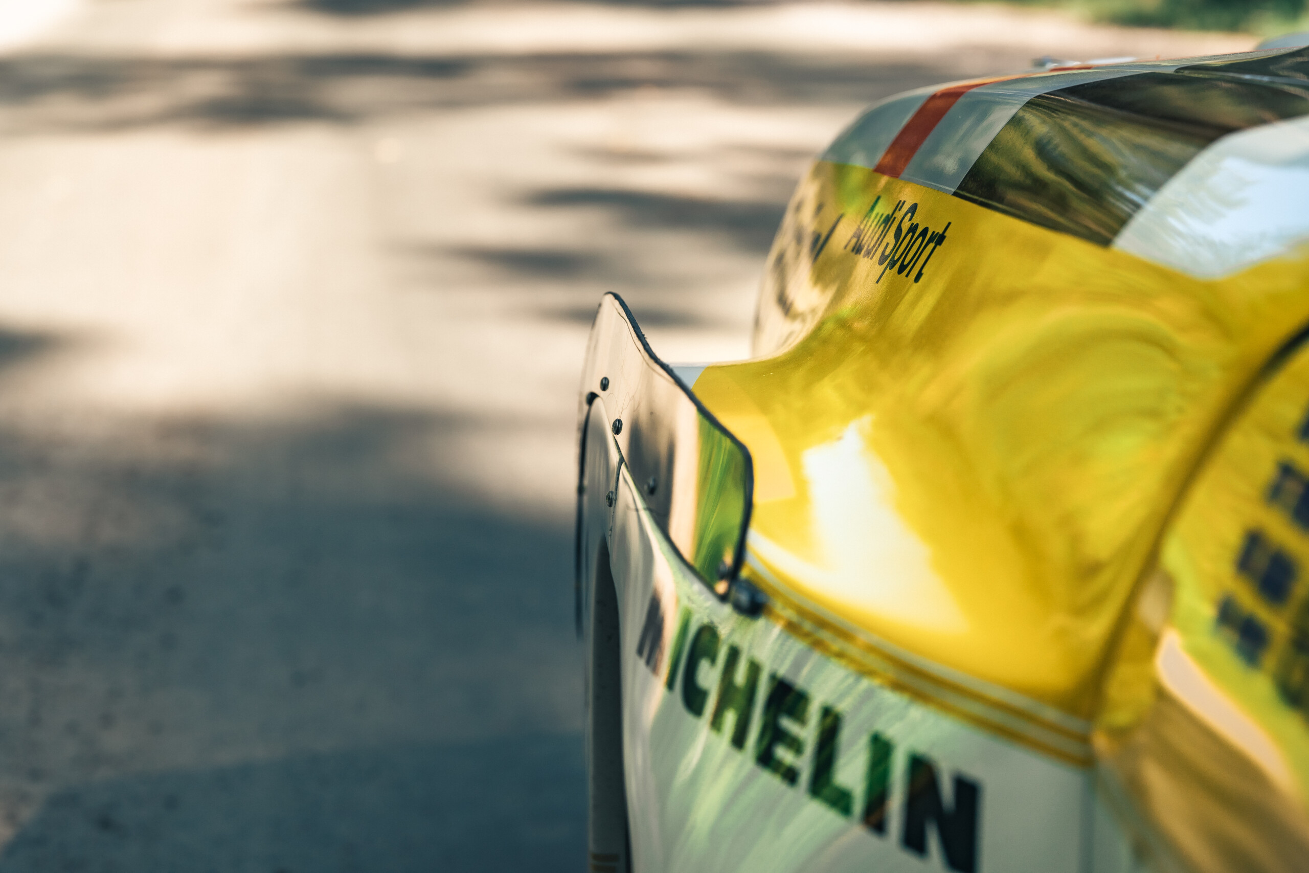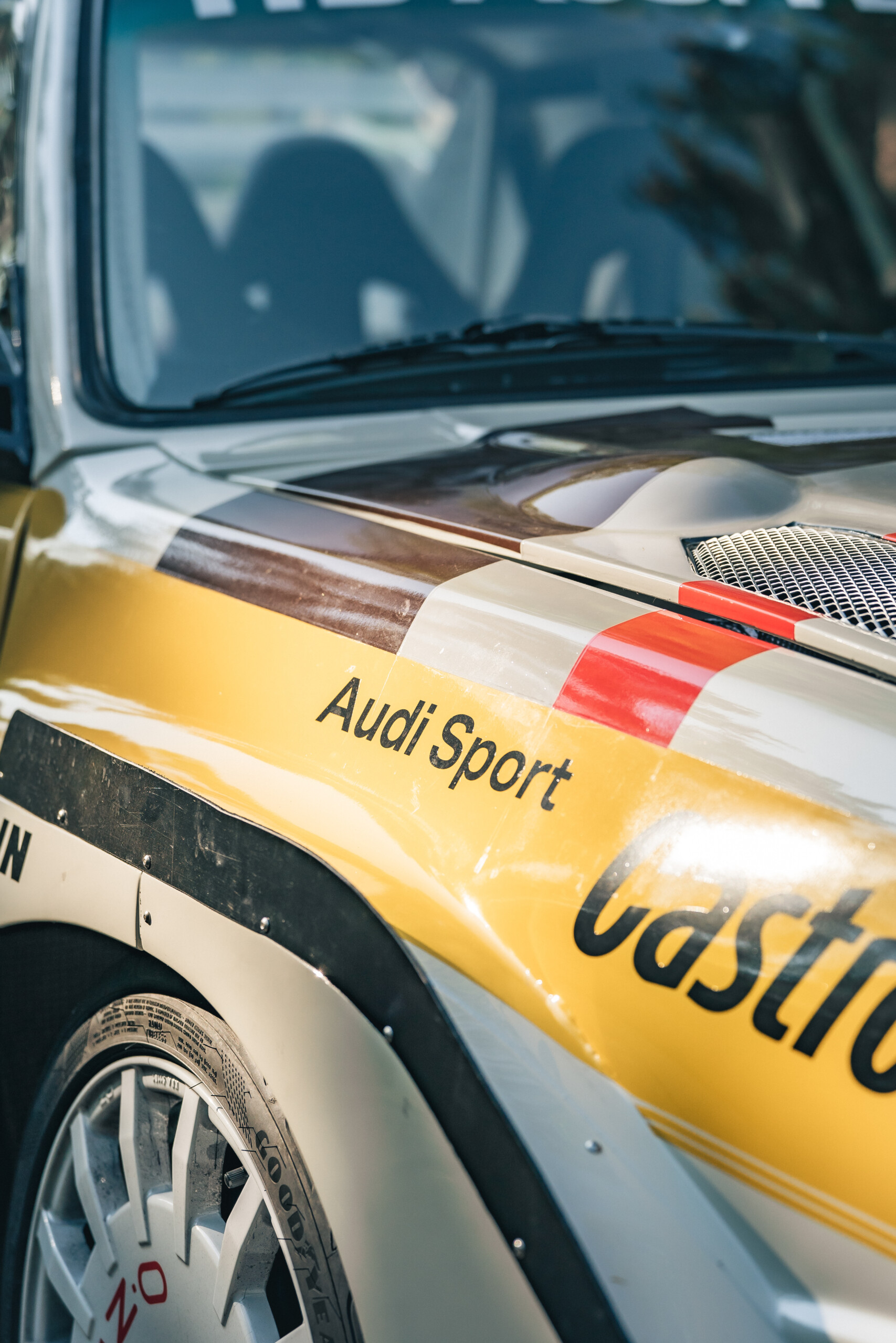 The body and wheelbase of the Sport Quattro were shortened by 32 cm over the rear side windows, and the steeper windshield angle was borrowed from the Audi 80. Large parts of the car were built using Kevlar and aluminum to save weight.