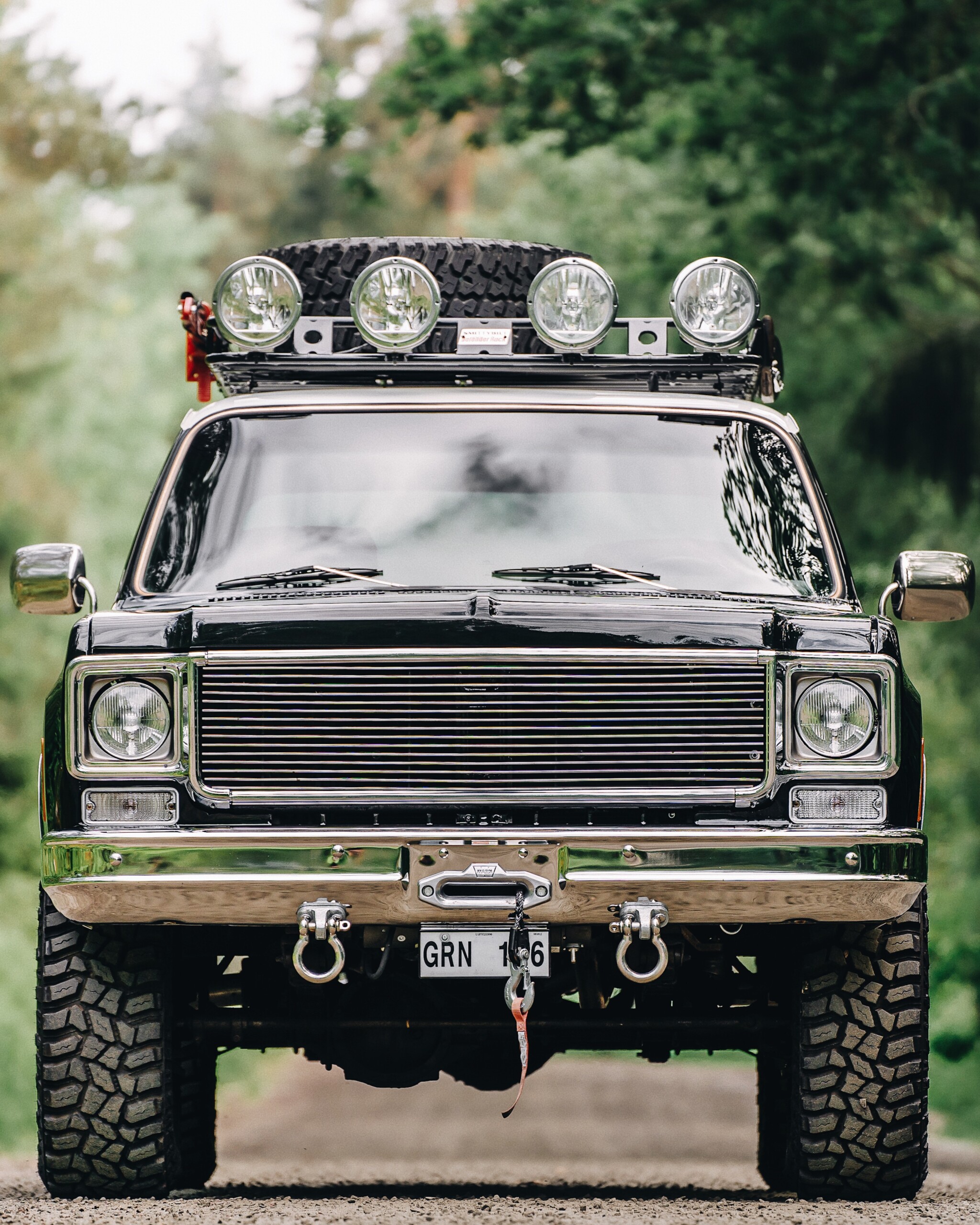 This vehicle is equipped for off-road use with 35-inch off-road tires, a lift kit, winch, roof rack, spare fuel cans, shovel, axe, jack, and spare wheel.