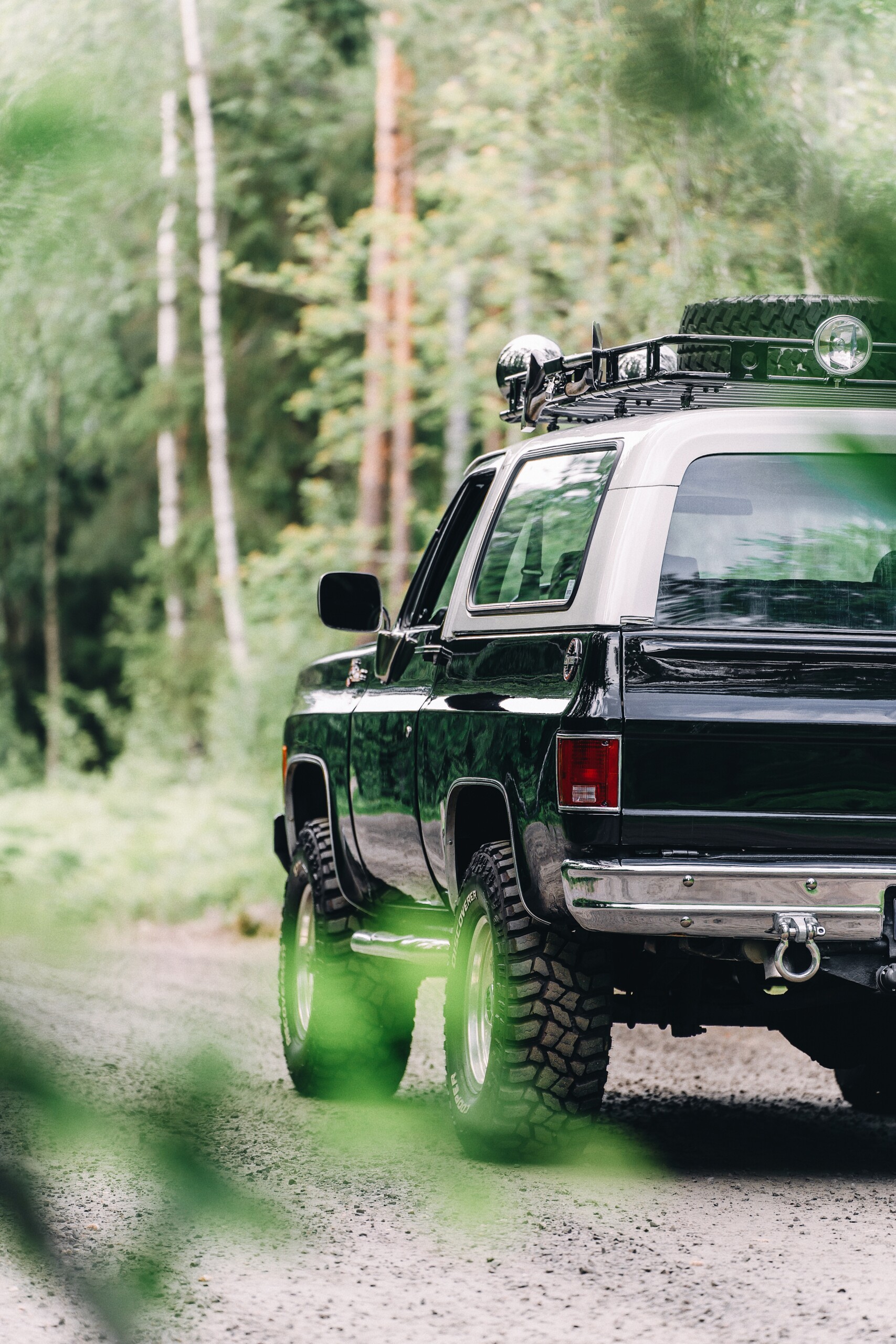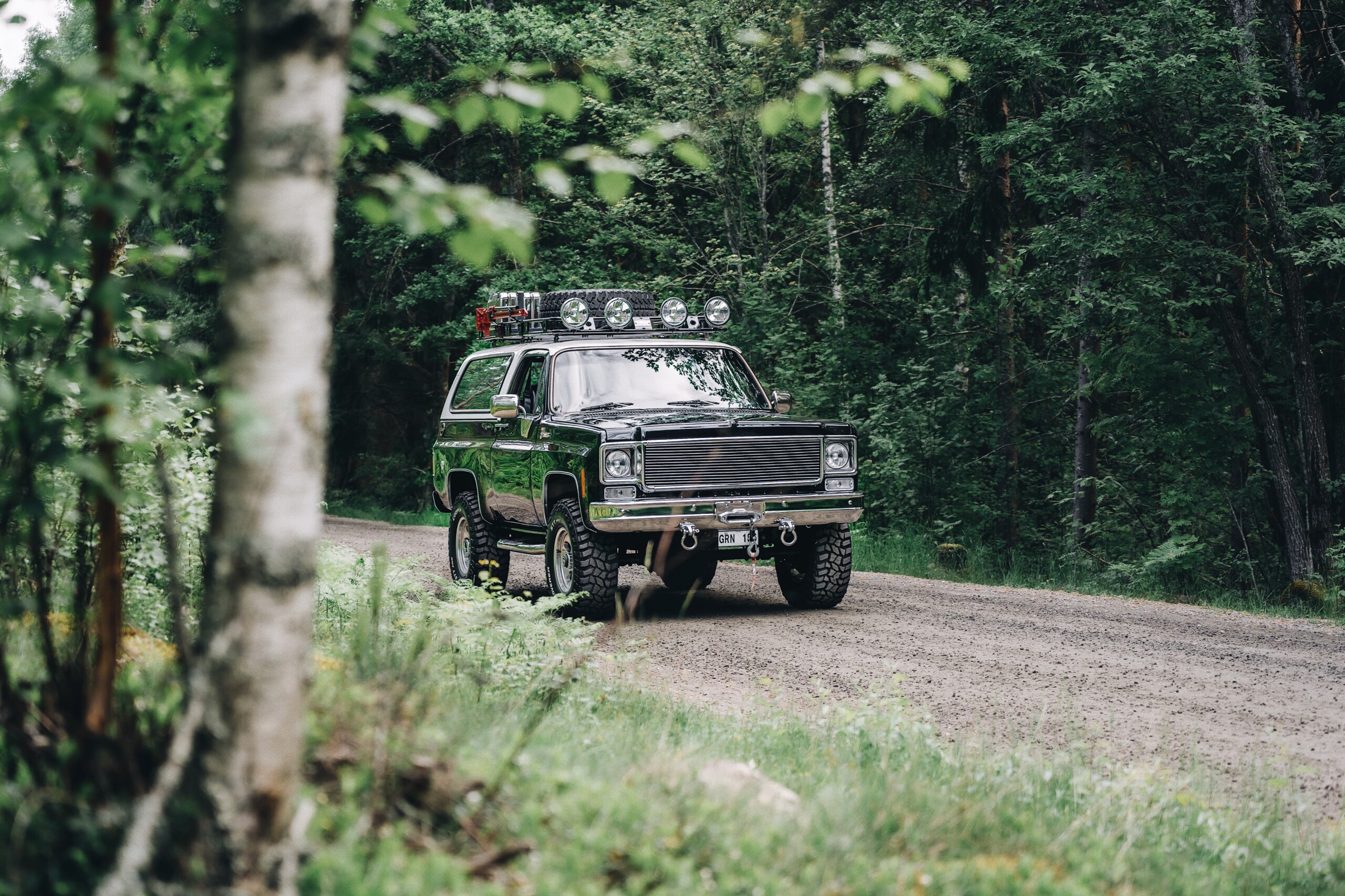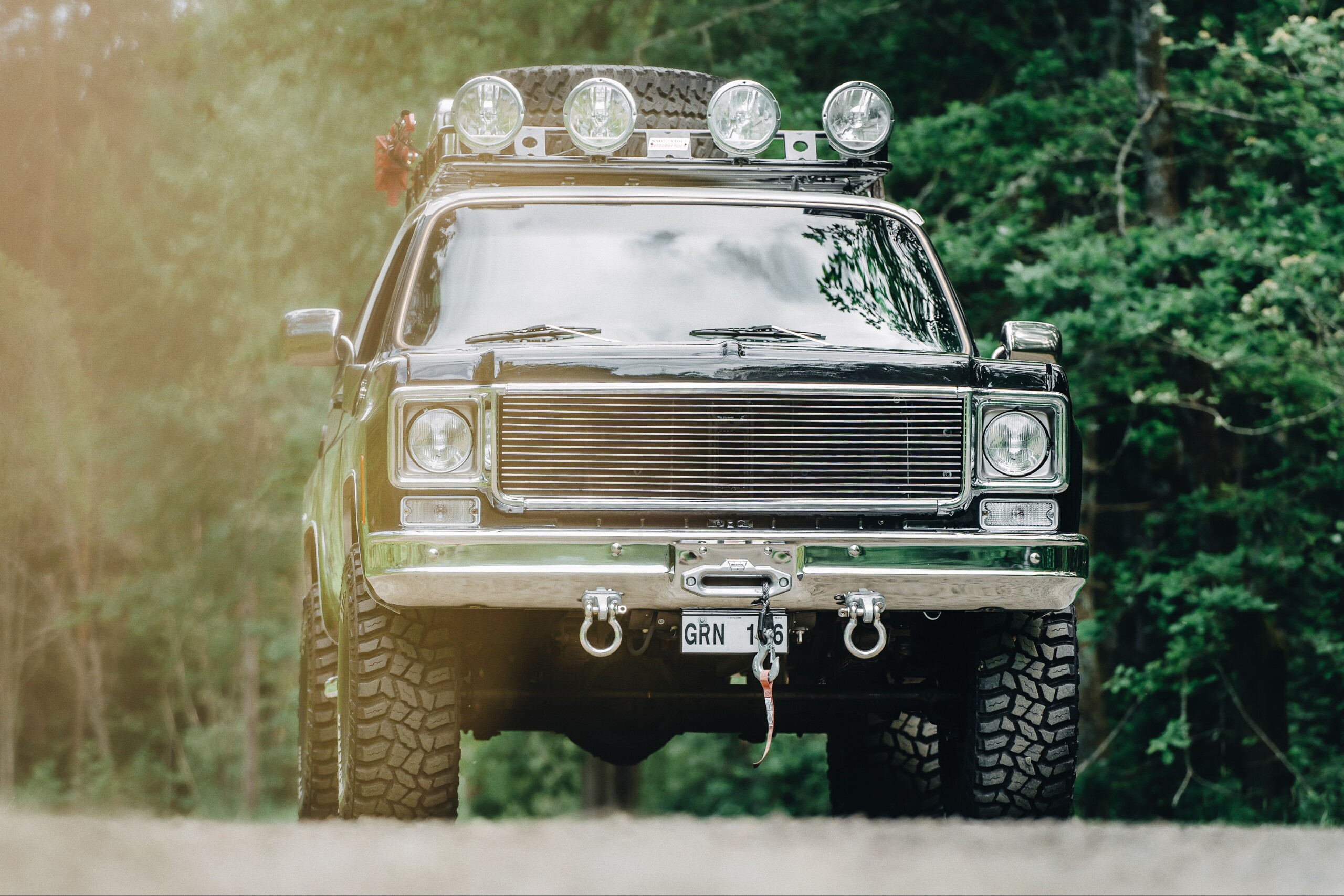 Bilen är offroadutrustad med 35 tums offroadhjul, höjningssats, vinsch, takräcke, reservdunkar, spade, yxa, domkraft, reservhjul.