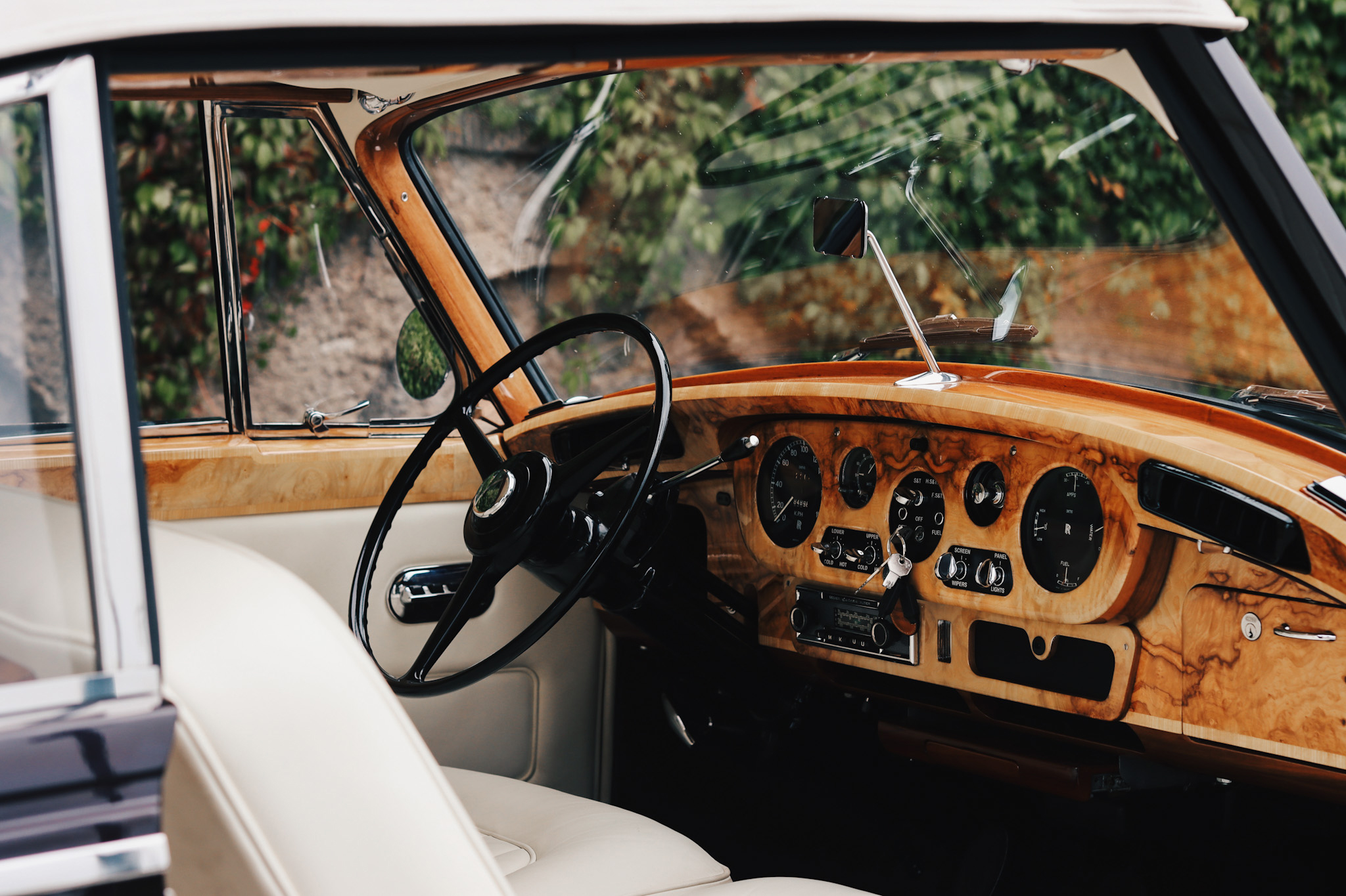 The interior is filled with wood paneling, leather upholstery, and chrome details.